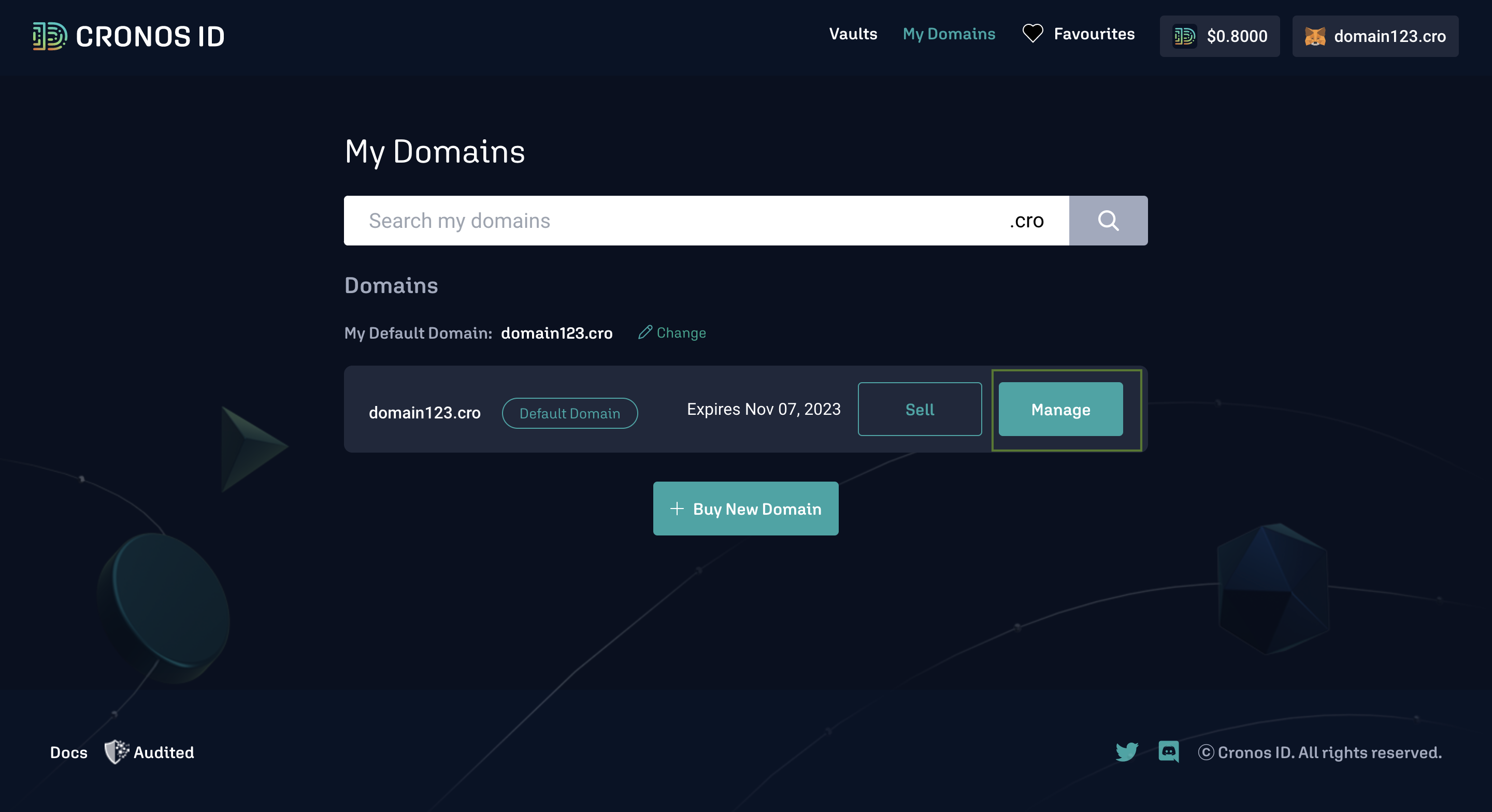 **Step 1.** Go to Cronos ID homepage and click “My Domains”.