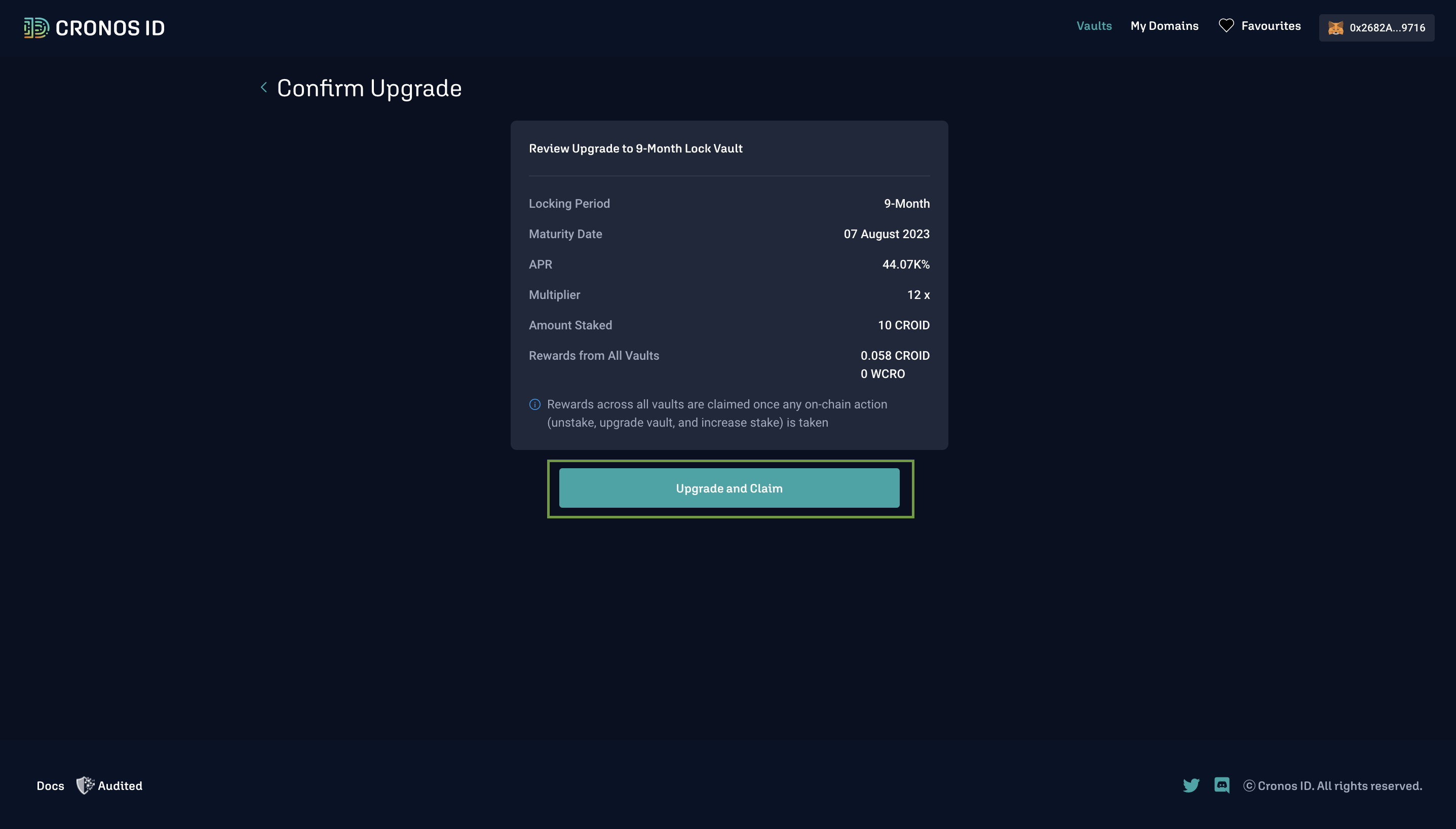 **Step 3.** Choose the desired vault to upgrade. You may upgrade both ongoing vault and vaults that have already ended. Click “Upgrade” to proceed.
